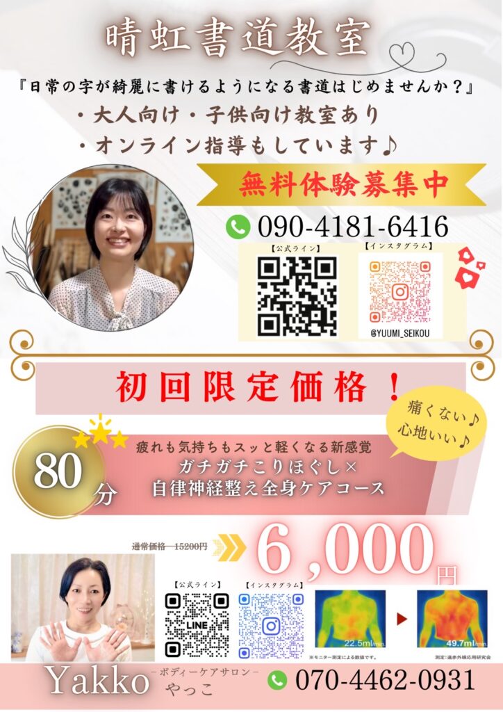 イベントのお知らせ 投稿日 2026年2月12日 著者 平松優美 3/8(日)カフェシフォンさんを貸切にし、イベントを開催します☺️ およそ半年ぶりの開催! ヤッコさんの心地よい微弱電流を体感していただき、ボールペンや筆ペンで美文字レッスンをします✨ そしておいしいシフォンケーキでくつろいでいってください😊 お電話やインスタDMでご予約承ります♪